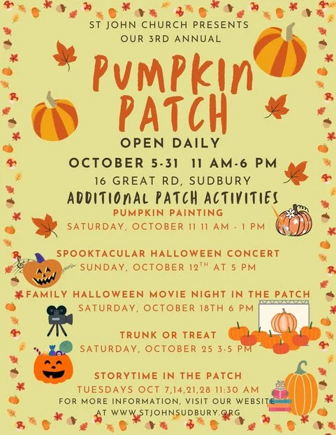 Our St John’s Pumpkin Patch returns for the third year! We will have pumpkins in all sizes, shapes, and colors from October 5-31from 11 AM-6 PM! Stop by our Patch at 16 Great Rd in Sudbury, at the intersection of Rt 117 and North Rd. It’s also a great spot for photos!